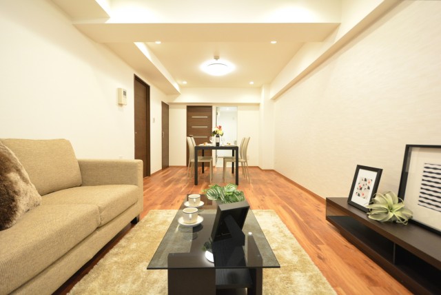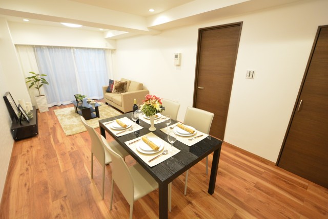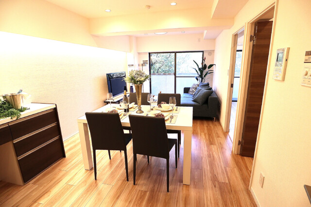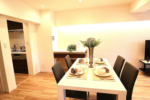 こちらは約11.2帖のリビング・ダイニング。約11.2帖と言っても最近はキッチンがひとつになったLDKが多いので、DKだけだとかなり広く感じます。縦に長く、リビングとダイニングの使い分けがし易そうなお部屋ですね。