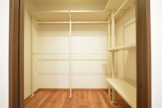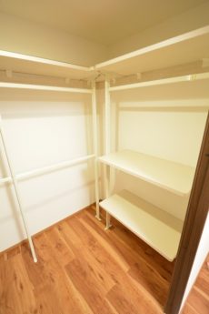収納はウォークインクローゼット。2帖以上ありそうです(私の感覚ですが^^;)設置されている棚やハンガーポールは自由に動かせますので、ご自身の必要に応じて調節する事も出来ますよ。