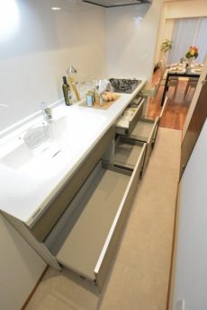 収納は調理台下と吊戸棚、かなり充実しています。引き出しタイプは出し入れがし易くていいですね。フライパンなどは立てて収納するとスッキリするらしいですよ。