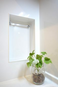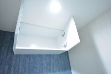 ホワイト基調で清潔感がありスペースも広々としているので、収納棚なども置けそうです。