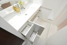 洗面台横には上部カウンターがあり、洗濯用品を置くスペースになりそうです。