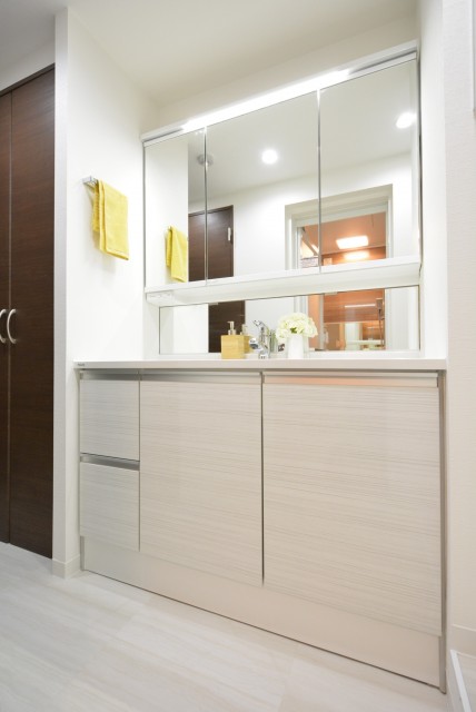三面鏡付きの洗面台。幅が広く二人で並んで使う事も出来ますよ。