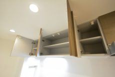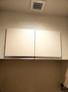 吊戸棚の他に、カウンターの下にも物入が。この位置の収納助かります。トイレブラシとか吊戸棚にしまう訳に行きませんからね^^;)