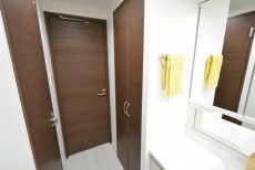 こちらには、収納棚、トイレ、洗面台、洗濯機スペース、浴室がまとまっています。