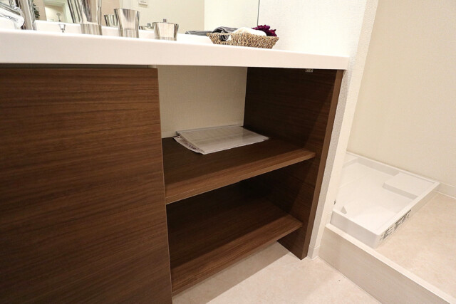 お湯でも洗濯できますね。汚れもよく落ちそうです。収納は鏡横のちょっとした棚と洗面台下部にたっぷりあります。