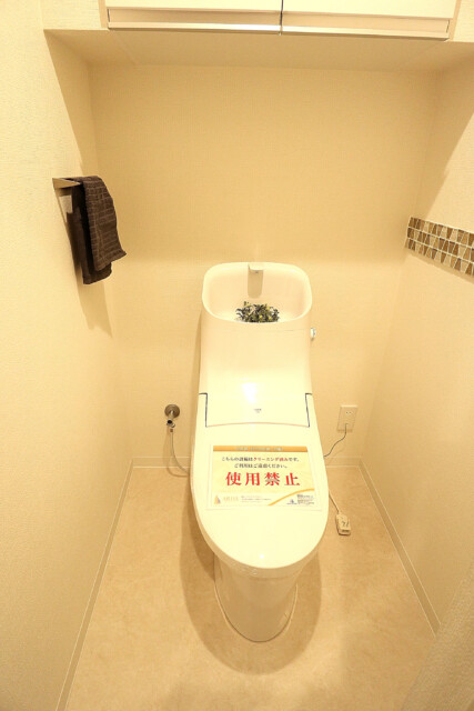 トイレは上部に収納棚。横にアクセントタイルがあります。