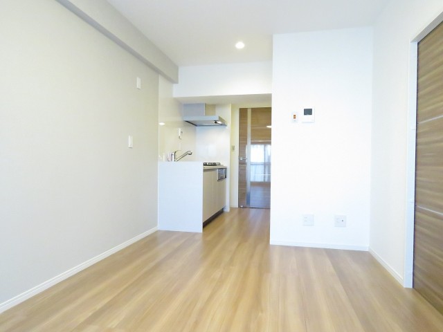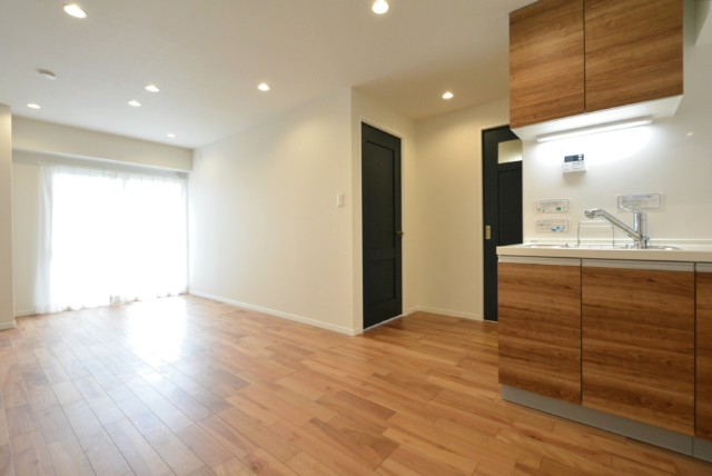 こちらは約13帖のリビング・ダイニング・キッチン。バルコニーに面した大きな窓のある明るいお部屋になっています。壁付けキッチンなので使えるスペースが広いですね。家具のレイアウトの自由度が高そうです。