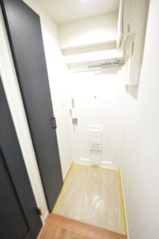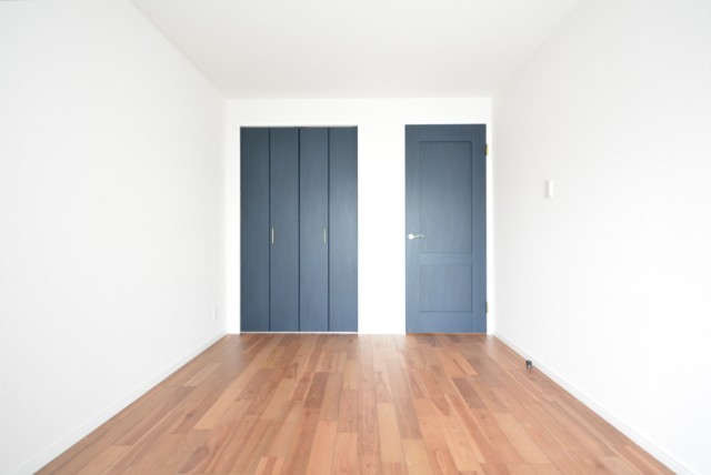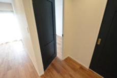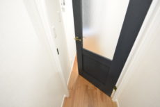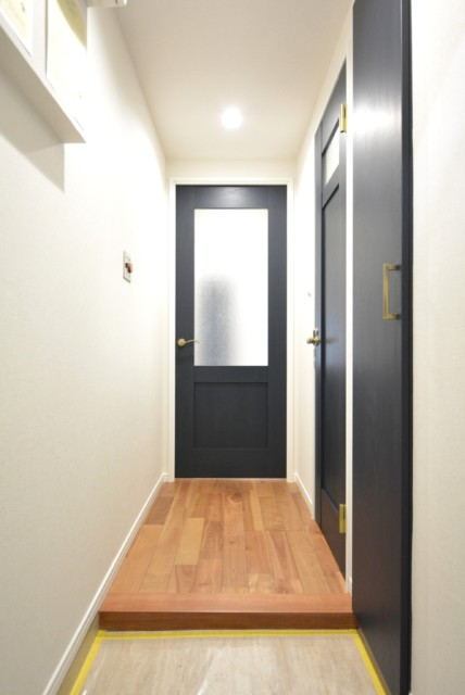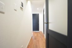 廊下は短め。ブルーのドアで爽やかな印象になっています。リノベーション完成直後という事でとても綺麗ですよ。