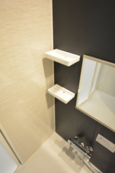 黒いアクセントパネルを使用した、落ち着いた雰囲気の浴室です。