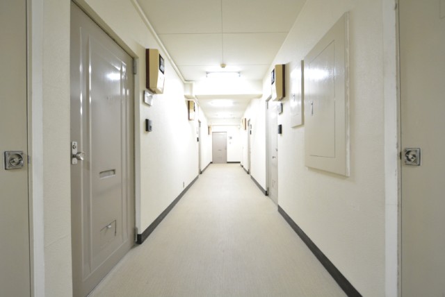 エレベーターは1基。97戸の戸数を考えると通勤・通学時間帯は少し待ち時間が発生するかもしれません。共用廊下は内廊下タイプです。