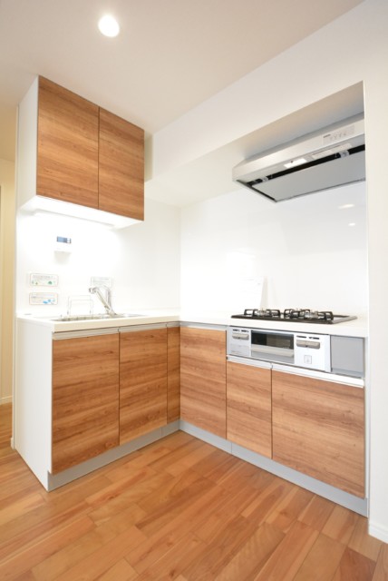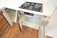収納は調理台下と吊戸棚。扉タイプの収納は奥の方がどうしても出し入れしづらいので、収納グッズなどを上手く使うと良いかもしれませんね。L字型のコーナー部分は、出し入れしやすいように扉が広く開くようになっていましたよ。