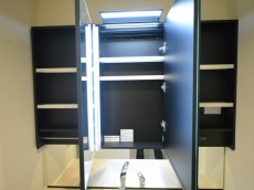洗面化粧台は鏡の裏に収納場所が確保されており、ゴチャゴチャ散らかりがちな小物類もスッキリ仕舞っておけるようになっています。洗面ボウルとカウンターが一体になっているのでお掃除がしやすいのも◎。