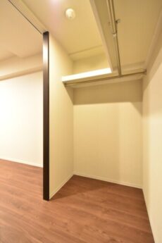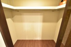 収納はウォークインクローゼット!!2帖近くあるでしょうか?コの字にハンガーポールが設置された大きなクローゼットです。洋服に限らずキャリーバッグやスーツケースなどの嵩張る物や、季節ものの家電などを入れたりと、幅広く使えそうな収納です。お洋服が多い方なら、衣装ケースなどで収納力をアップするのもいいかもしれませんね。