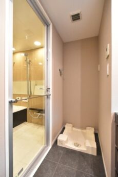 奥には洗濯機スペース。吊戸棚などはありませんので、ご自身で棚など設置すると便利だと思います。やはり「使う所に…」ですからね^^;)気になられているかもしれませんが、浴室のドアはなんと素通し!