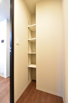 廊下の先には収納棚。左は幅広め、右は奥行き深めと形が違いますので、入れる物によって使い分けるのがよさそうですね。