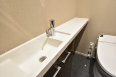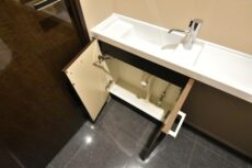 手洗いカウンター付。下には掃除道具など吊戸棚に入れるのはチョット、といった物が収納可能です。