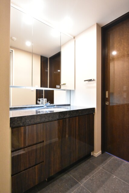 三面鏡付きの洗面台は重厚感のあるデザイン。低い位置にも鏡が付いていて小さなお子様にもやさしい造りです。ゆったり幅で2~3人なら一緒に使えそうなので、朝のラッシュ時にも安心ですよ。