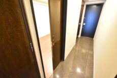 玄関から続く廊下は石貼りの床にダークブラウンの建具。幅も広くて高級感たっぷりです。