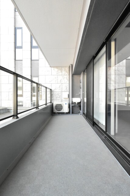 ホールを進むと更に二つめのオートロックがあり、そこを抜けて内廊下へ。内廊下は雨風の影響を受けずセキュリティにも優れています。暗くなりがちなところですが、随所に窓が設置され明るい空間になっています。