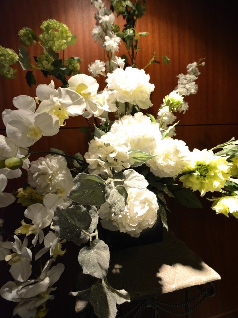 採光の取れた明るいエントランスを抜けると、大理石の壁と素敵な花が出迎えてくれます。