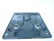 3口ガスコンロ、グリル、浄水器一体型水栓付きです。
