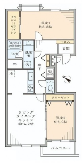 続いて14.2帖のリビングダイニング、キッチンは独立タイプです。