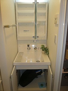 洗面化粧台は鏡の裏が収納になっており、ゴチャゴチャ散らかりがちな小物類もスッキリお仕舞いただけます。洗面ボウル下の収納スペースにシャンプーのストックなどを入れて置くのもよさそうです。