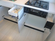 収納は吊棚がないのでシステムキッチンの後ろに食器棚を置いた方が良さそうです。
