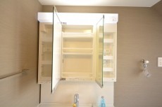 洗面台は3面鏡でモチロン、鏡の裏は収納スペースになっております。