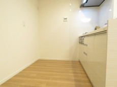洗濯機置場はLDK内にあり、ちょうどキッチンの斜め後ろあたりにあります。お料理しながらお洗濯と家事もまとめて片付けやすそうです。洗濯機を使わない時は扉を閉めておけば生活感も隠しておけます。洗濯機の横はカウンターになっています。