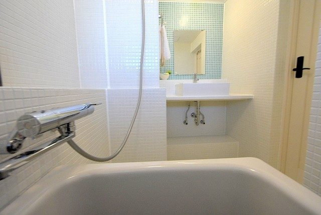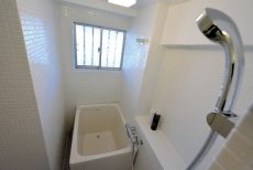 バスルームは追い焚き、浴室換気乾燥機能付き。窓際のスペースはシャンプー類の置場にちょうどいいですね!