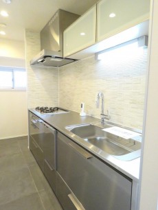 キッチンスペースは約3.7帖。縦長の細長い空間で一番奥側に冷蔵庫が置けるようになっています。床は下の階の洋室と同じくグレーのタイル貼り。
