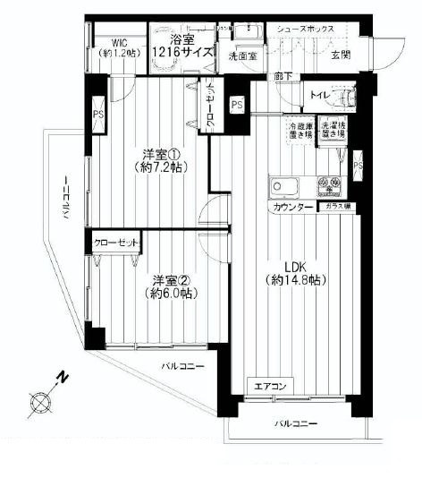 南東・西向き、角部屋の2LDK+WIC 62.65㎡