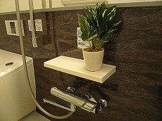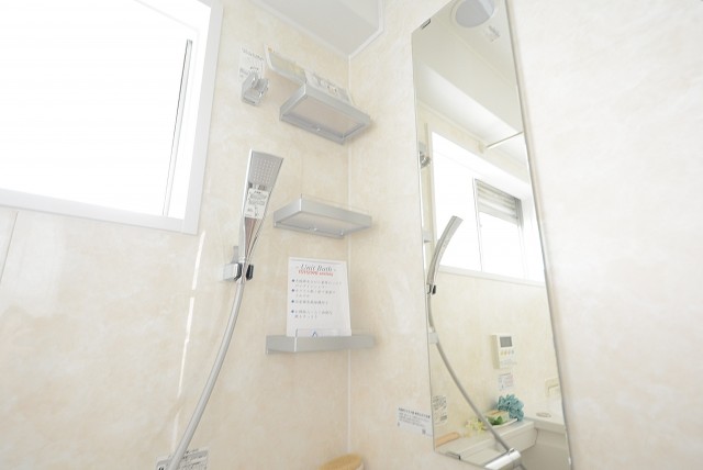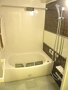 追炊き機能付きバスルームです。ブラウンのタイルがアクセントになっており、リラックスできる入浴タイムがおくれそうです。ワイドにあるミラーが浴室を広々とみせてくれています。