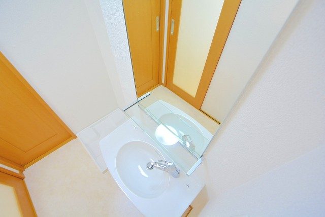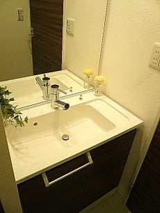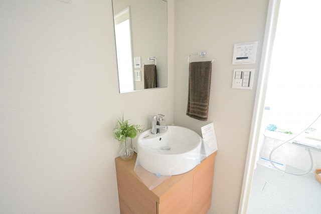 洗面化粧台です。大きな鏡はとてもみやすく朝の準備もバッチリ決まりそうです♪