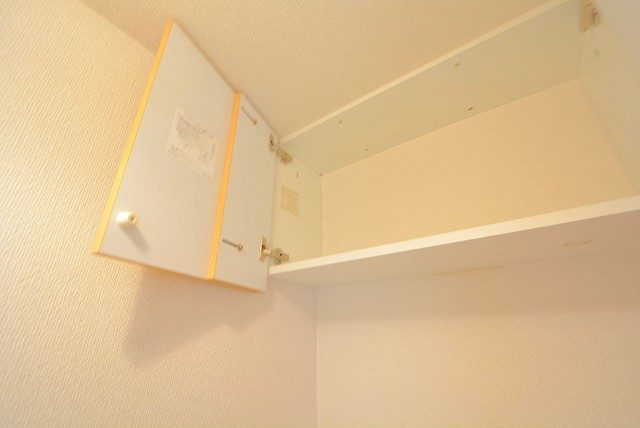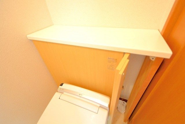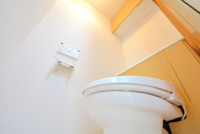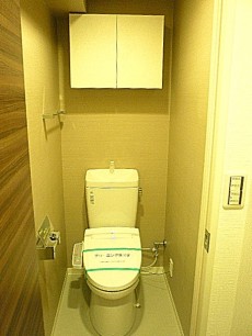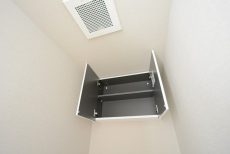 廊下左手にある節水型の環境に優しいウォシュレット付トイレです。上部にはホワイトな吊戸棚が設置されています。ストックしておきたいトイレットペーパーはこちらへ♪
