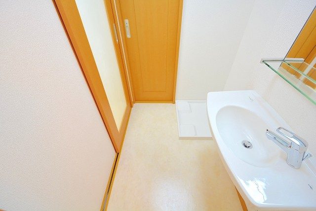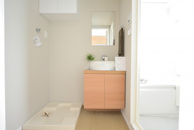 玄関正面にあるサニタリールームです。正面にバスルーム、右手に洗面化粧台となっています。