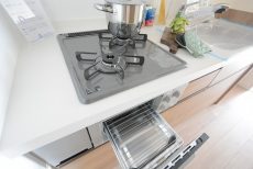 後片付けの助っ人といいたくなる食器洗浄機発見!洗い物の時短ができ家族との時間が増える!うれしい機能ですね!大きなシンクと3口コンロ、スムーズにお料理ができそうです。