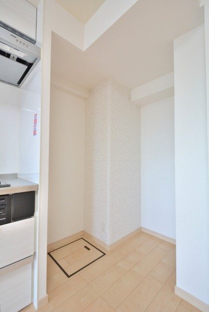 洗濯機置場の上には収納棚が設置済み。洗濯用品はこちらへどうぞ。