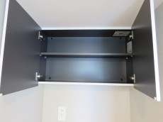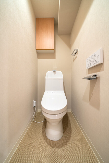 トイレは洗浄機能一体型。トイレットペーパーや掃除道具などの収納に便利な吊り戸棚も付いています。