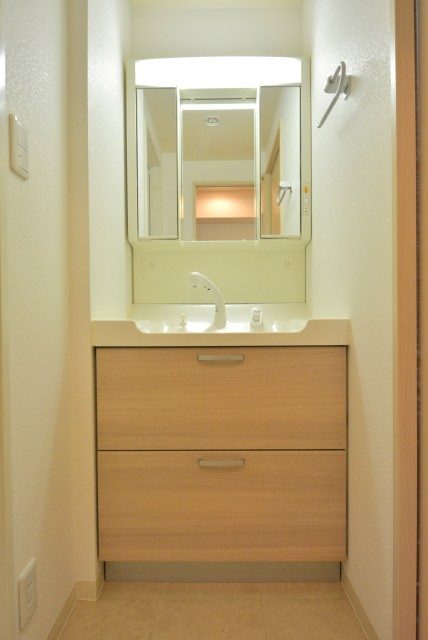 洗面化粧台は三面鏡なので、お化粧やヘアセットが楽々できてとても便利。