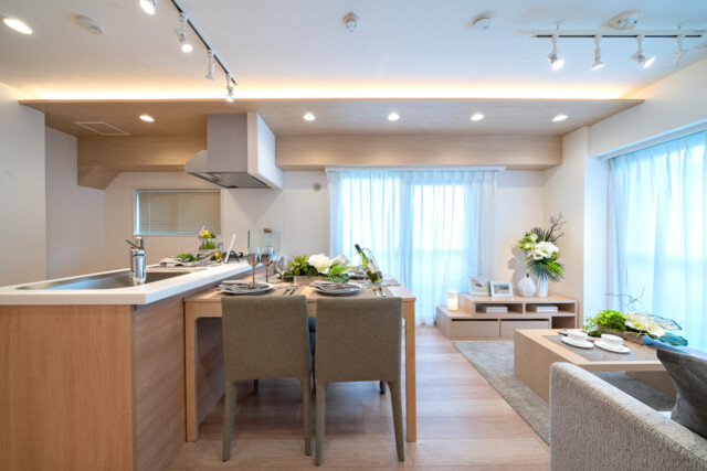 家具は展示用なので付いては来ませんが、ディスプレイしてもらうと実際の生活をイメージしやすくていいですよね。この感じ好みにピッタリ!とか、ダイニングテーブルをもう少し小さくしてリビングを広くしようかな?とか、もっとシックな雰囲気が好きだから家具はモノトーンやアイアン素材などをチョイスしようかな?とか・・・いろいろ参考にさせてもらいましょう!