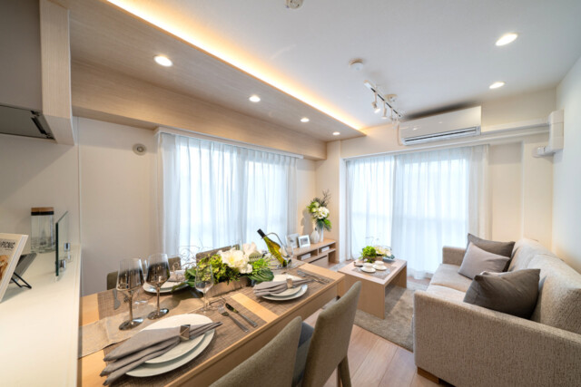 南東・北東向きの二つのバルコニーに面した二面採光のお部屋です。ナチュラルカラーでコーディネートされ落ち着いた雰囲気。木目パネルで付加された天井や間接照明など、ワンランク上の仕上りになっています。