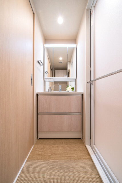 【洗面室:三面鏡付き洗面台・洗濯機スペース】