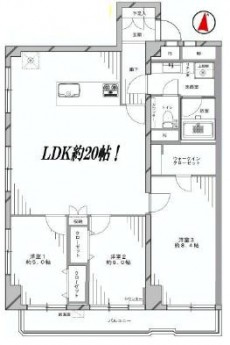 廊下の正面のドアをあけますと広々とした20帖のリビング・ダイニング・キッチンです。リビングを通り3つの洋室に入る間取りは、いつも家族と顔を合わせられる嬉しい間取りですね。