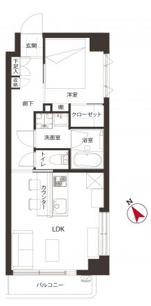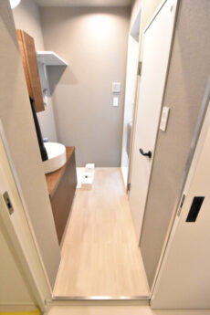 玄関入り右側にブラウンの廊下がみえます。左側にはサニタリールーム、正面にはリビング・ダイニング・キッチン+洋室があります。