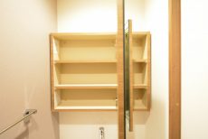 洗面台お隣にある洗濯機置き場です。丁度良い棚もあります。こちらに洗濯洗剤やお気に入りの柔軟材も置けますね。お隣に高さのある収納棚があるので洗剤置き場は丁度目隠し代わりになりそうです。