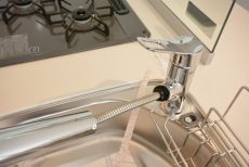 洗面化粧台は鏡の裏が収納になっています。大きな引き出しもあり、小物類からドライヤーまで色々仕舞っておけそうですよ。水栓はホースを引き出してシャワーとしても利用可能です。寝ぐせはこのシャワーでパパッと直してしまいましょう!