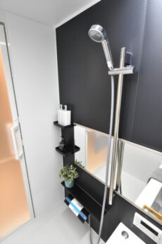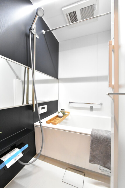 パナソニック製浴室換気乾燥機付きバスルームです。アクセントパネルが大人な雰囲気の落ち着いた浴室です。一日の疲れもとれリラックスできる時間を過ごせそうですね。