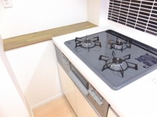 お料理のしやすい3口コンロに浄水器付水栓、上部にも吊り棚があり、カウンターの裏側は、写真の様に、棚を付ければ収納スペースに早変わり♪